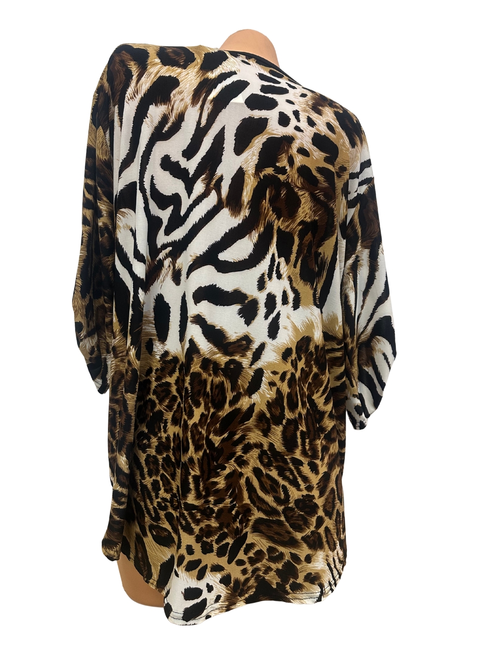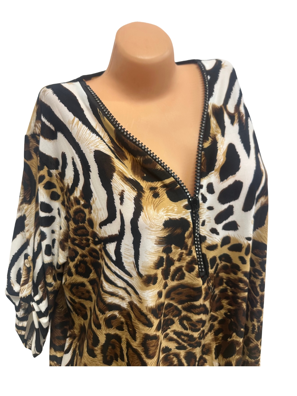 Animalprint Bluse | V-Ausschnitt mit Zipper | Onesize 44–46