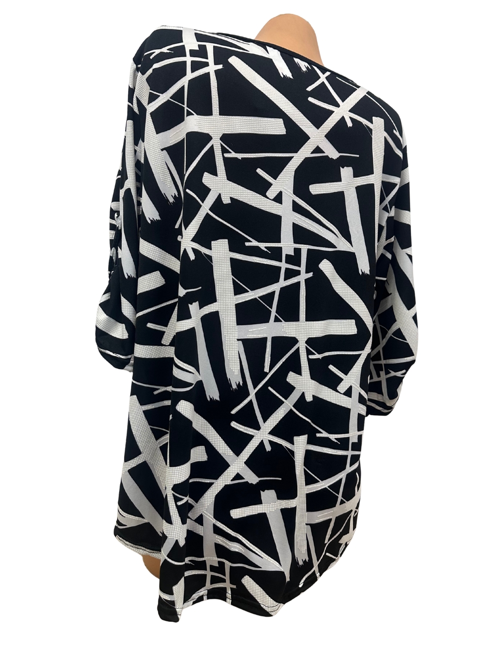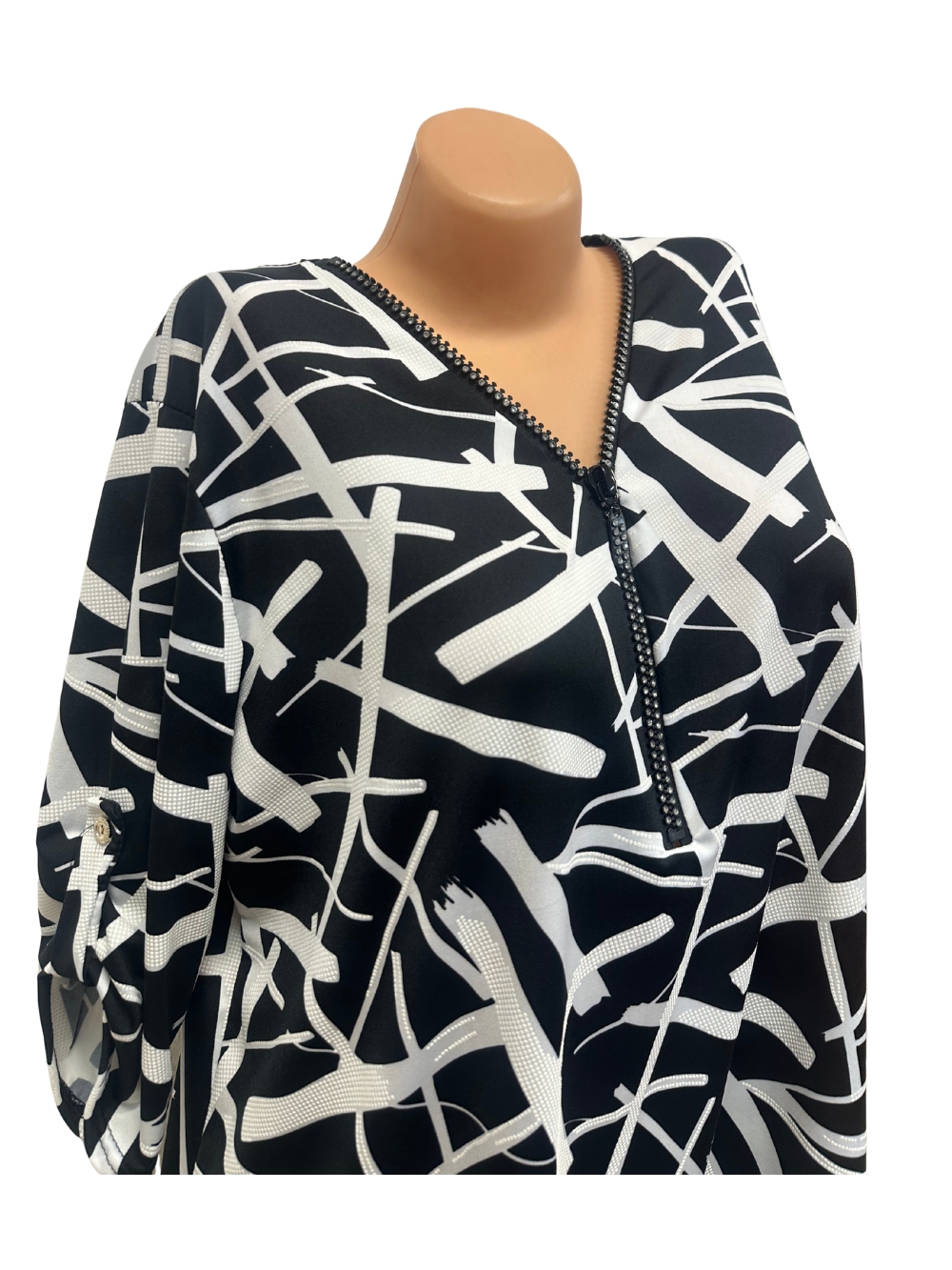 Grafikprint Bluse | V-Ausschnitt mit Zipper | Schwarz-Weiß | Onesize 44–46