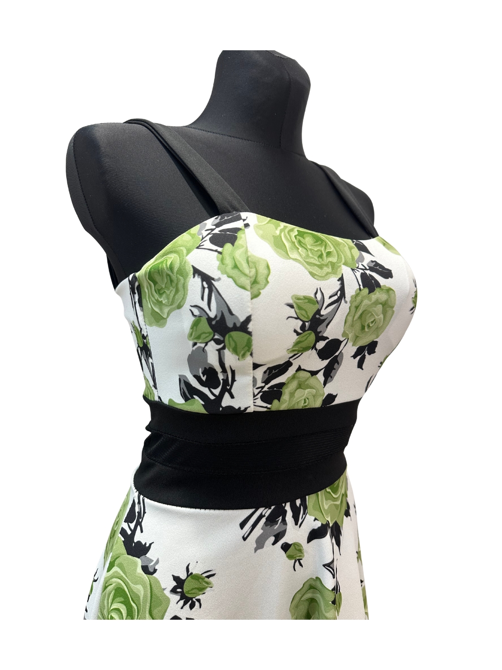 Midikleid mit Trägern | Grünes Rosenmuster | Polyester | Onesize M–L